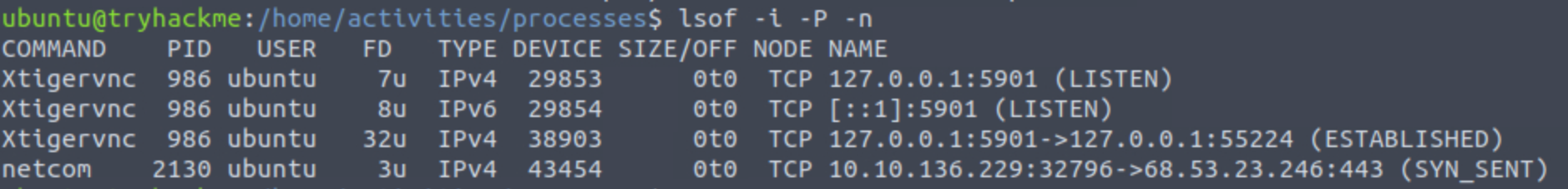 lsof: List Open Files, affiche les infos sur les fichiers ouvert par les processusi: affiche les infos sur les connexions réseau, y compris les socketsP: affiche les ports utilisésn: transforme les nom DNS en IP