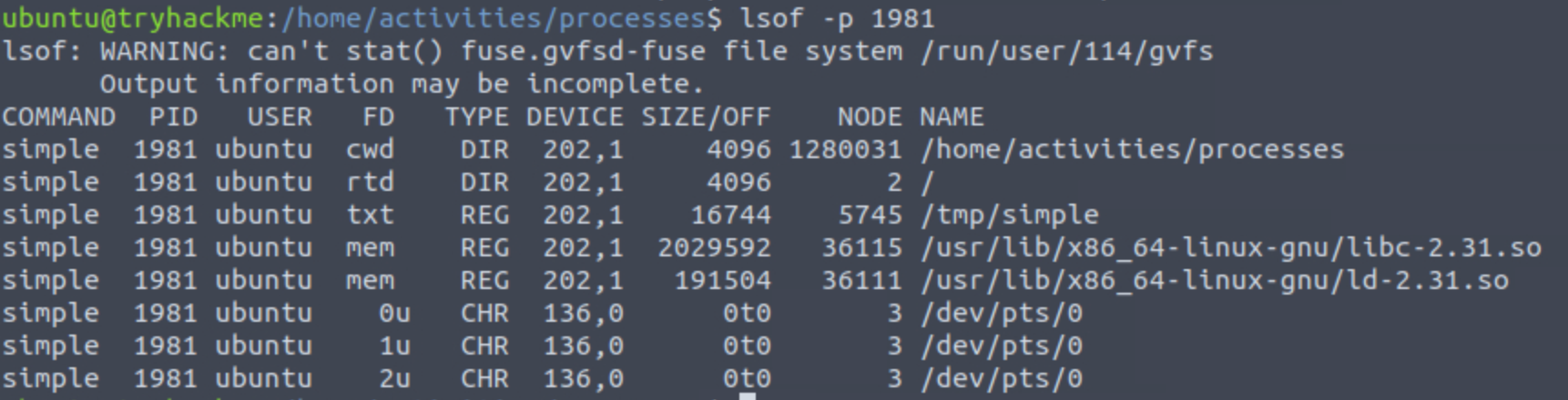 Avec le PID nous pouvons faire une recherche plus appronfondie, comme les ressources qu’utilse notre binaire. Nous allons faire ça avec la commande lsof.