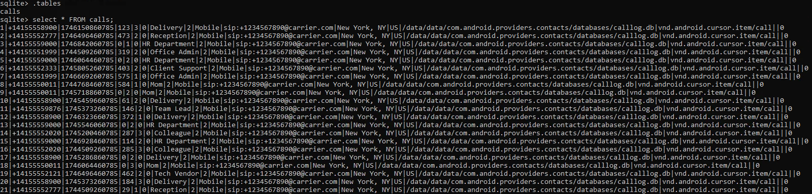 - Journaux d’appel : /data/data/com.android.providers.contacts/databases/calllog.db